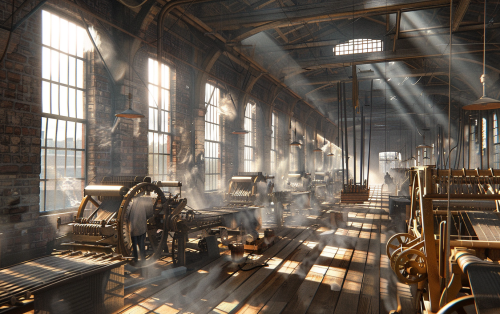 A photorealistic scene of an English textile factory in the 1800s, workers operating large steam-powered looms inside a dimly lit, expansive brick building. Sunlight filters through tall, dirty windows, casting beams across wooden floors. The air is thick with dust, and steam rises from machinery, creating a hazy atmosphere. Workers wear simple clothing of the era, with expressions of concentration as they labor among rows of intricate metal machines. The background shows stacks of raw materials and finished fabrics, adding to the sense of industry --ar 8:5 --v 6.0