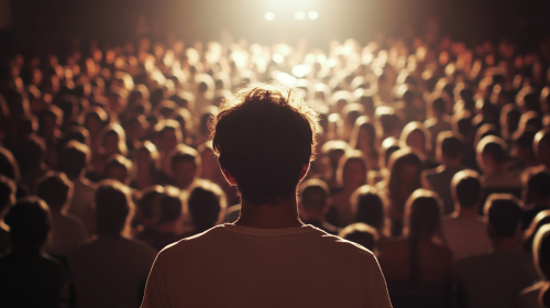 a pthoto of a conference hall with big crowd. camera is positioned behind a crowd and towards the speaker, done with wide angle camera 35mm lens. People dressed casually, happy but toned atmosphere --ar 16:9 --v 6.1