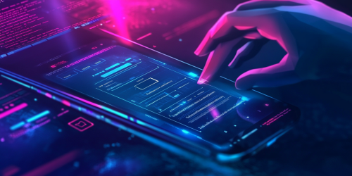 An illustration of a sleek, futuristic chatbot interface on a smartphone or laptop, with a person’s hand typing a question. The background can show flowing data or lead icons. Low poly. minimalistic --ar 2:1