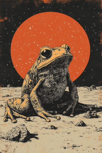 Big frog in mars, doom illustration, t-shirt graphic, centered on a plain background, glow, old, dirty, worn, surreal, block colours, block print style, lino print style --ar 2:3