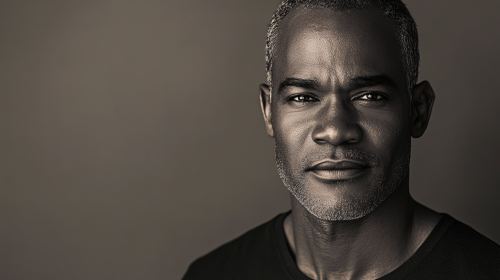 a monochrome photo high key of a dark skinned middle aged man with smooth face and short hair dramatic editorial on a gray backdrop in a photo studio --ar 16:9