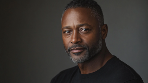a photo of a dark skinned middle aged man with a round smooth face and short hair and a black shirt on in dramatic editorial style on a gray backdrop in a photo studio with a fractcal blur on the left side of the frame --ar 16:9