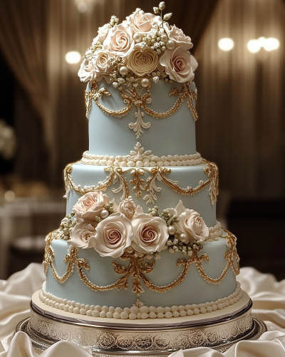 Create a multi tiered wedding cake design that is inspired by Rococo design of 18th century French Aristocracy. Use Light Blue fondant for the base cake. Bright white buttercream fancy borders. Gold Royal icing fancy filigree and paisley and swirl designs. Small Roses in white and pink. Rhinestones and gems and large iridescent pearls. Green mini grape bunches. This cake sits on a beautiful silver cake stand on a dessert table with layers of satin ruffle tablecloth. The background has curtains and there are spotlights on the cake. --ar 4:5 --v 6.1 --stylize 300