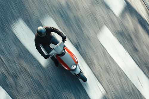 A man riding an electric scooter on a NYC road, top view, speed motion blur, designed by nendo and Zaha Hadid , grey metal material with white lines, minimalism, industrial design, industrial style, layered forms, octane render, gray background, natural light, high resolution photography, --ar 128:85