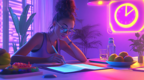 A vibrant, realistic image of a cheerful woman sitting at a modern desk, enthusiastically writing in her planner. Bright symbols of healthy habits like a yoga mat, colorful fruit bowl, water bottle, and a large, eye-catching clock surround her. The room is bathed in warm, vivid lighting, creating a dynamic and motivating atmosphere. The woman’s expression is full of joy and optimism, radiating energy and excitement about building new habits. High resolution, 1920x1080 pixels, --ar 16:9