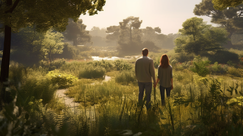 Create a photorealistic scene of a couple standing together, looking at an empty plot of land surrounded by lush nature. The area appears untouched, with signs that construction is about to begin. The couple, viewed from behind, is facing towards the open space, contemplating their future. The atmosphere is calm but filled with potential, with warm sunlight filtering through the trees, casting a hopeful glow on the scene. Make the colors soft and earthy, evoking feelings of anticipation, possibility, and connection to nature. --ar 16:9 --v 5.1 --s 750 --style raw