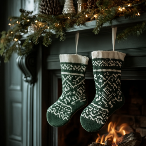 beautiful Christmas socks,hanging on the fireplace,play of light and shadow,cozy atmosphere,Christmas time, soft color palette dark green,white and silver