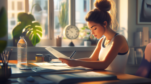 An image of a confident woman sitting at a desk, focusing intently on her planner or journal. Around her are symbols of healthy habits like a yoga mat, a glass of water, and a clock. The scene feels modern and minimalistic, with soft lighting, creating an atmosphere of focus and dedication. The background is subtly blurred, highlighting the woman as she works on establishing her new routines, with a sense of accomplishment and motivation. High resolution, 1920x1080 pixels, --ar 16:9