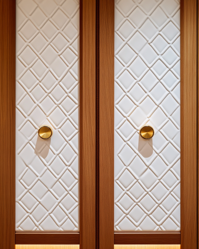 Product photography of a wooden cabinet with white, diamond-shaped patterned doors, each featuring a golden button in the center. Captured from the front view with hyper-realistic detail and high resolution, the cabinet is displayed in a modern showroom or studio setting. The scene emphasizes elegance and luxury, with soft, diffused lighting from multiple angles to highlight the textures of the wood and shimmering accents on the buttons. Taken in 2024 with a Nikon Z9 and a 50mm lens, using Fujifilm Pro 400H film stock for smooth tones and soft contrasts. Warm wood tones complement the subtle white patterns and golden highlights, creating an inviting and refined aesthetic --ar 4:5 --style raw --v 6.1
