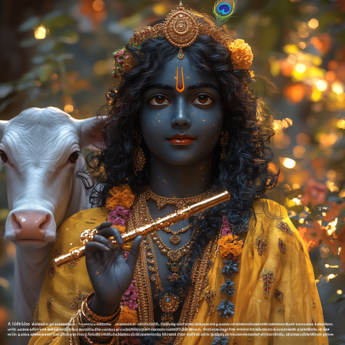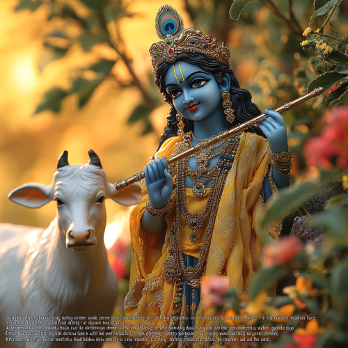 "A hyper-realistic portrayal of Lord Krishna standing in a lush green meadow at sunset. His skin has a radiant blue hue, glowing softly in the golden light. Krishna’s face is youthful, with wide lotus-shaped eyes radiating compassion and a gentle smile that exudes divine charm. His crown is intricately designed, adorned with a vibrant peacock feather that sways in the breeze. He wears a flowing yellow silk garment that complements the natural surroundings. Krishna holds a flute to his lips, playing a melody that seems to bring harmony to the environment. Beside him is a serene white cow with soft brown eyes, leaning affectionately toward him. The background features tall trees, a river reflecting the warm tones of the sunset, and wildflowers swaying gently, creating an atmosphere of profound peace and divinity. The overall scene feels alive, yet tranquil, capturing the essence of Krishna in his most beautiful and realistic form." --s 750 --style raw