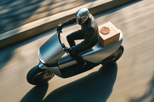 An overhead shot of the person riding an electric scooter, designed by Jony Ive and Dieter Rams in sleek grey metal with black accents, there's a pizza box on the back, captured at high speed to freeze motion, creating blurred background for focus on vehicle and rider, emphasizing modern design and performance --ar 128:85