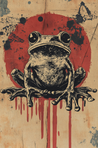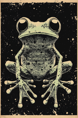 Exotic frog, doom illustration, t-shirt graphic, centered on a plain background, glow, old, dirty, worn, surreal, block colours, block print style, lino print style --ar 2:3