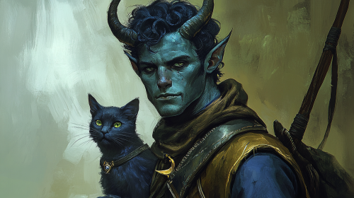 tiefling ranger, old lined face, dark blue skin, hunting with cat companion, short curly hair, long horns, old, style of video game concept art, --ar 16:9