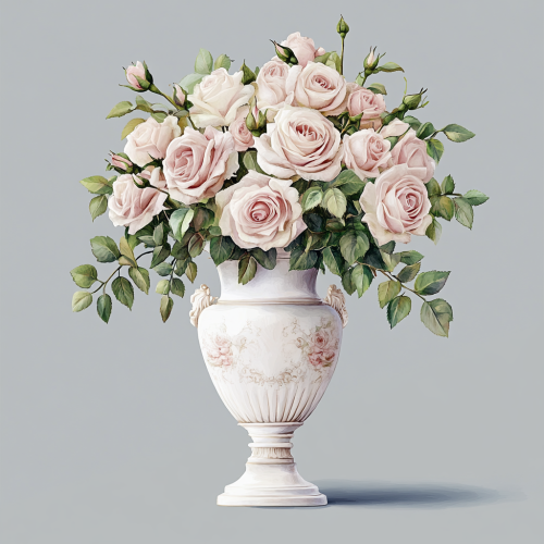 highly detailed watercolor clipart of a beautiful white porcelain vase with a huge bouquet of roses in a light pastel pink color, soft colors, luxurious aesthetics, beautiful illustration with realistic details, high resolution, gray background