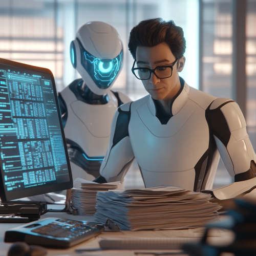 generate a photorealistic image of attentive bookkeeper, wearing glasses and focused on financial records, is reviewing detailed spreadsheets and ledgers for accuracy. The workspace is filled with stacks of papers, a computer screen displaying complex financial data, and a calculator. Behind the bookkeeper stands a sleek, futuristic AI robot, equipped with glowing screens and digital interfaces, assisting in the review process. The setting is a modern office with soft lighting, creating a contrast between human diligence and robotic efficiency.