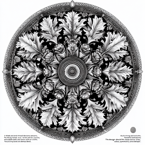 "A black and white mandala design inspired by autumn, featuring intricate patterns of leaves, acorns, and other autumn elements. The design should be suitable for a coloring book, with clear lines and no colors, focusing on symmetry and detail."