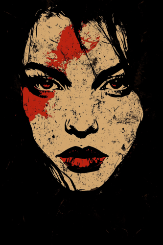 Face of norn girl witch, doom illustration, t-shirt graphic, centered on a plain background, glow, old, dirty, worn, surreal, block colours, block print style, lino print style --ar 2:3