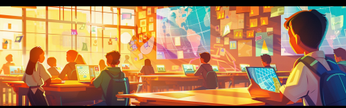 A colorful illustration of a high school social studies classroom, students actively engaging in a gamified learning activity. Virtual game icons and pop-ups surround students as they interact with maps and digital trivia on tablets, all under a vibrant, cartoon-style aesthetic. Bright posters of world history and geography line the walls, glowing with animated icons. Sunlight streams through large windows, adding a lively and energetic atmosphere, soft shadows enhance depth --ar 16:5 --v 6.0