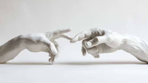 Close-up of two hands trying to touch each other with their index fingers. The hands are matte white ceramic statues. The left hand is from a man and the right hand is from another more masculine and thick man. White background --ar 16:9