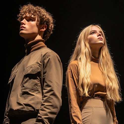two monochromatic costumes for a utopian dream ballet. One male with brown curly mullet wearing a turtle neck and jacket and one female with long blonde hair.