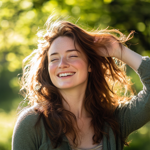 A candid, outdoor portrait shot with a Sony Alpha A7, featuring a woman with natural, imperfect beauty and vibrant, healthy hair, captured from a dynamic angle. She’s smiling energetically, with one hand playfully running through her hair, dressed in a casual, natural outfit with long sleeves, avoiding a summer look. The natural light enhances her authentic appearance, and the soft, nature-inspired turquoise background blends seamlessly with the outdoor setting. The shot feels lively and real, perfect for a hair product campaign that highlights genuine, relatable beauty.