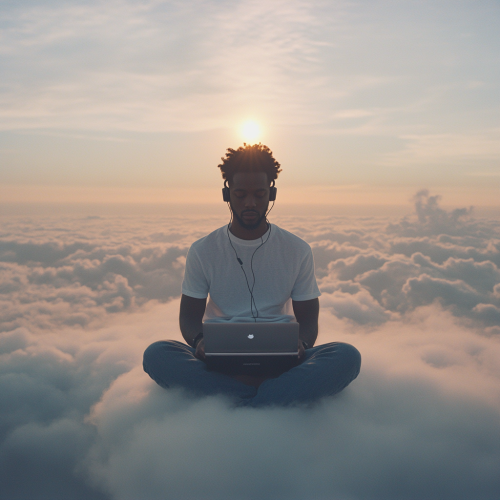 A distant, far-away shot of a young African-American man sitting calmly on a cloud, approximately 500 feet away from the camera. He has black skin and is dressed in urban clothing--jeans and a white t-shirt. He’s wearing headphones connected to his laptop, which is placed on his lap. The composition is perfectly level, with the man centered in the frame. Above him, the top half of the photo is filled with a soft, lunar sky, featuring a radiant sun beaming through. The bottom half of the photo shows a serene sunset casting warm, orange-pink light on the clouds beneath. The shot is captured in Kodak 8K, with a 9:16 aspect ratio, using slight motion blur for a dreamlike feel. The overall atmosphere is peaceful and surreal, combining both earthly and celestial elements as the man floats in the middle of the clouds and sky