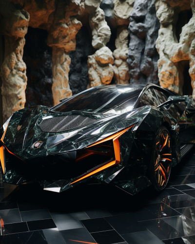 Craft a visually striking Instagram post featuring a luxurious image of an giant black and oange gem enveloped in an enchanting layer of jade crystals. With a bright backdrop of glossy white marble, the fusion of the powerful vehicle and the mesmerizing crystal coating exudes opulence, capturing the attention of viewers and evoking a sense of wonder and fascination --ar 4:5