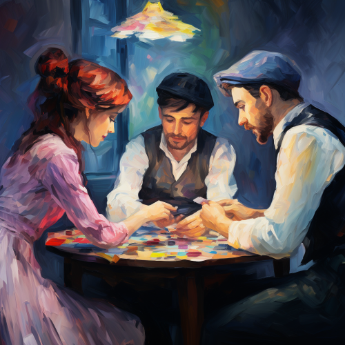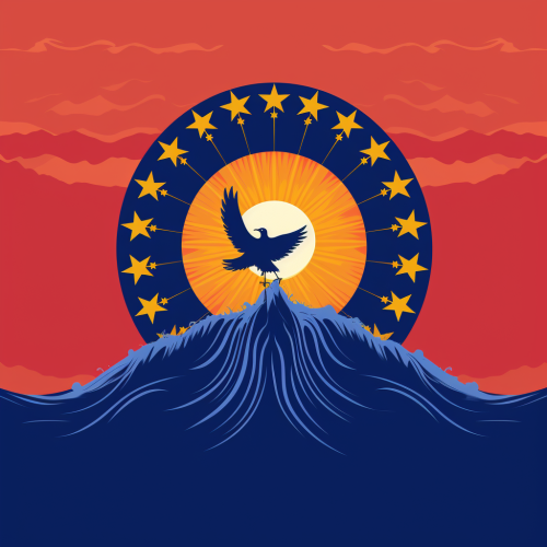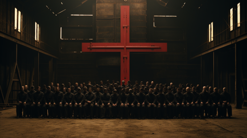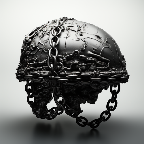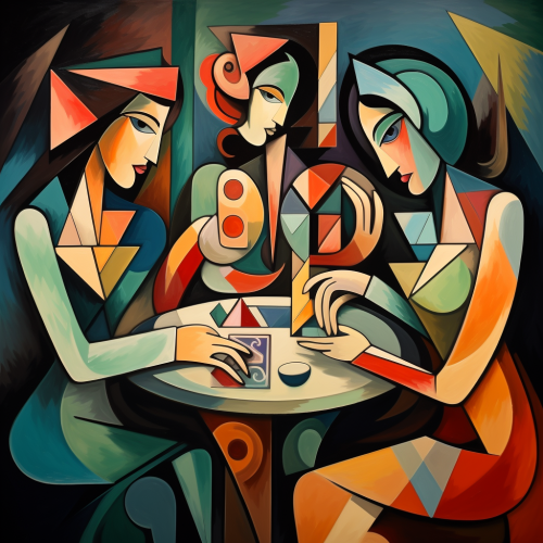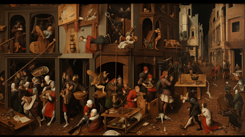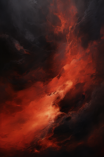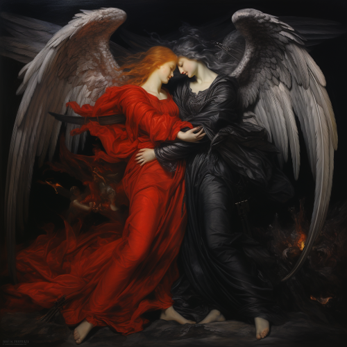 Hyperrealistic painting depicting two female angels in an embrace, symbolizing love and support. The first angel has large black wings and a flowing red gown, representing passion, while the second angel has dark gray wings and a black gown, representing despair. They are surrounded by abstract representations of various sins, such as greed, envy, and pride, each depicted through symbolic objects or scenes. The background is filled with intricate patterns and abstract shapes representing the complexity of human emotions and the interconnectedness of sins. The painting should have intense lighting, saturated colors, and bold brush strokes to enhance the visual impact of the image.