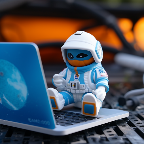 duck figurine in a light blue astronaut suit, playmobil toy watching a livestream on its laptop