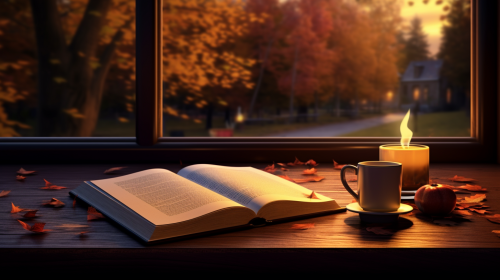 coffee, book and unlit candle with relaxing background, big window, autumn colors, night, Ultra-realistic, ultra-hd, 8k --ar 16:9 --v 5.2