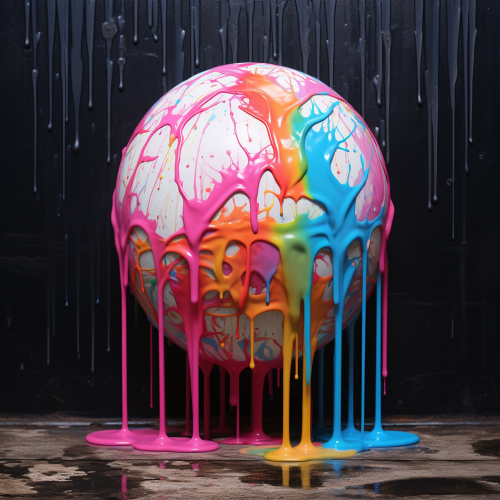 realistic white sphere dripping in multi color paint, street art style, spray paint, all white studio space