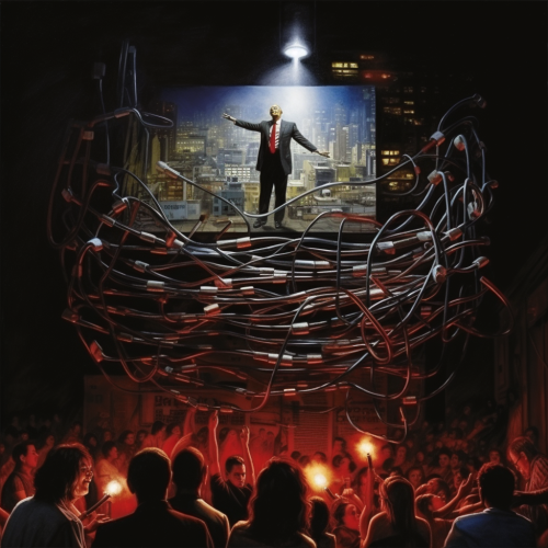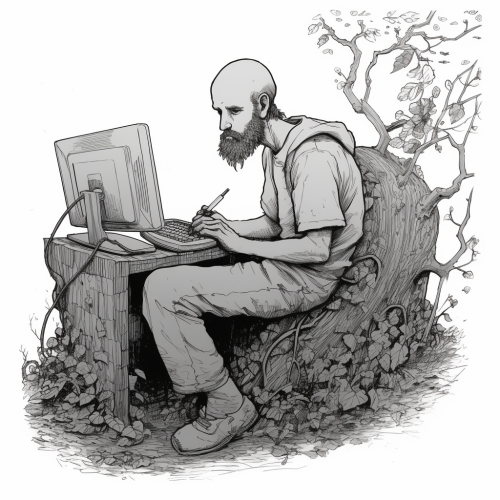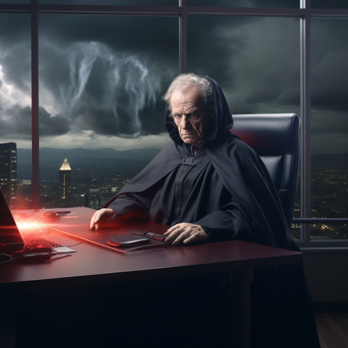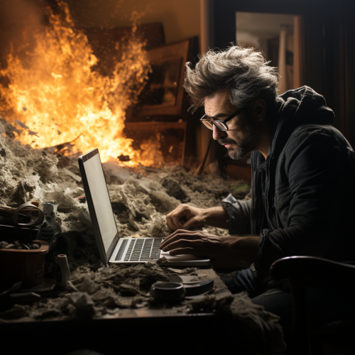 "Generate an image or describe a scene in text where a man is sitting in a dimly lit room. He has just opened his laptop, and an intense, blinding light is emanating from the screen. This brilliant light reflects off his glasses and causes a sudden tornado to form within the room, creating chaos and a mess. Capture the dramatic moment when these elements come together, and showcase the effects of this unexpected event on the room and the man within it --s 250