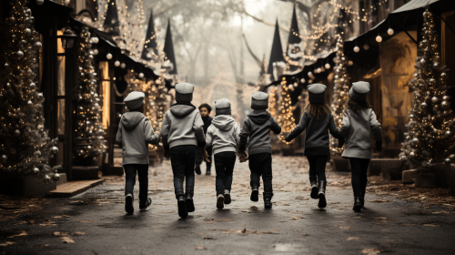 Eccentric and quirky children are dancing awkwardly but happily through a festive mountain Christmas village. They are meticulously posed and positioned in a minimalist symmetrical setting. Black and white with vibrant color splash. Vibrant hues. Tapestry of whimsy. nostalgia with a dash of quirky charm. Shot with a Pentax. K - 3 III Monochrome. Santa hats. Christmas tree in background. Presented in pop art style. Extreme close - up camera angle. Very close. Low angle camera shot. Looking straight up, Blurred background. Bakeh elements. High - end. Very Stylish. Black and white photograph. --ar 16:9 --q 0.5 --s 750