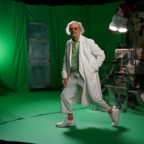 full body shot of Christopher Lloyd as doc Brown from Back to the Future faced away from the camera in front of an all green chroma key green screen background