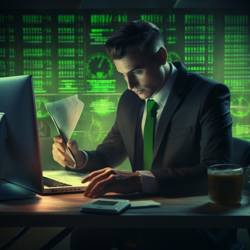 a suspicious corporate person in a suit manipulating a purchase order commiting fraud on a computer monitor with a caution sign and green checkmark on it