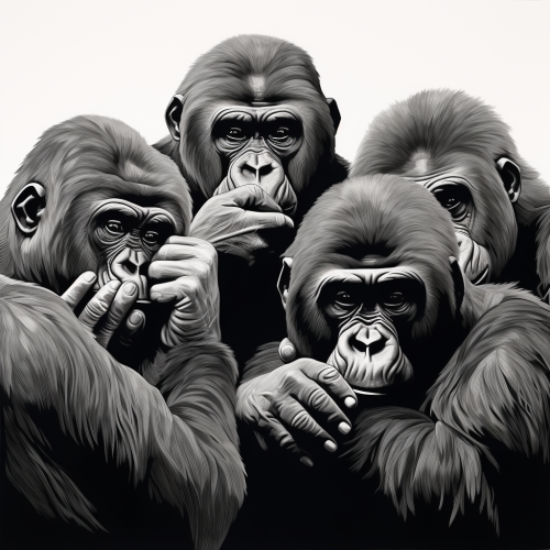 four gorillas, one covers his ears, one covers his eyes, one covers his mouth, and one stares at his cell phone. only black and white - only contour, no shadows