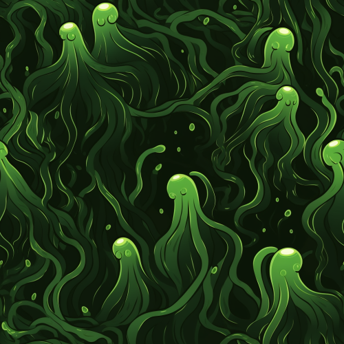 a seamless pattern with green slimy tentacles on dark background, low resolution, simplistic, --tile