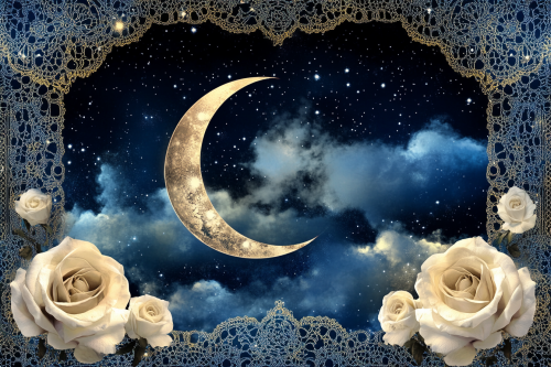 Beautiful night sky with stars and clouds, a blue lace border, white roses in the corners, a crescent moon, in the style of digital art, detailed, hyper-realistic, with black, gold, and silver metallic colors, beautiful, elegant, fantastical, intricate details, high resolution, high definition. --ar 3:2