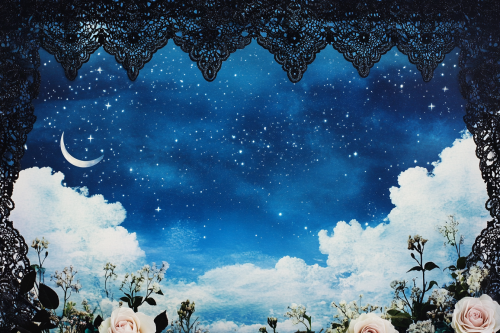 Wallpaper with a black lace border, a blue sky with white clouds and stars at night, roses at the bottom of the frame, a crescent moon, a celestial theme, in the style of digital art. --ar 3:2