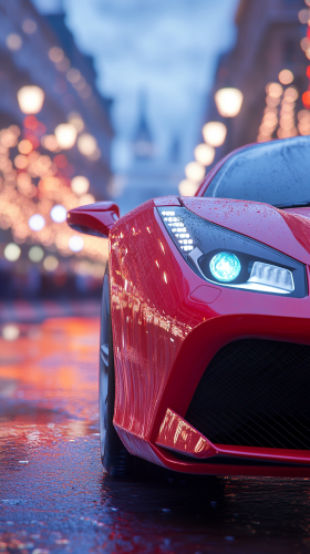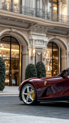 A close-up of a luxurious maroon Ferrari 812 Superfast, taken from a dynamic angle that captures the elegant curves of the car's body. The shot emphasizes the gleaming chrome accents and the iconic prancing horse emblem. The background features a high-end shopping district, with softly blurred boutique storefronts, creating a sophisticated and opulent atmosphere. Photorealistic, highly detailed, 8K resolution --ar 9:16 --v 6.1 --style raw