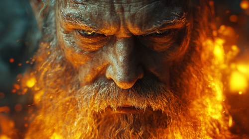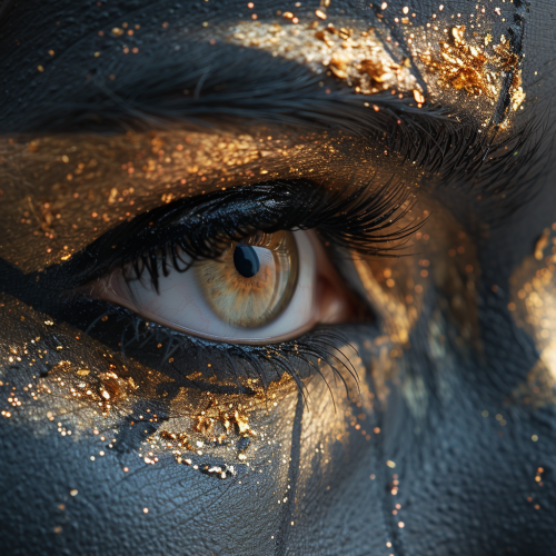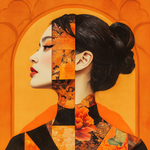 Create a Cubist reimagining of an Asian woman's portrait, fragmenting her face into bold geometric planes showing multiple perspectives simultaneously. Maintain the original's warm amber and orange palette but break it into sharp, angular sections. Transform the neck tattoo into an abstract pattern of interlocking shapes that defies natural perspective, while the traditional hair bun and flower should become a dynamic explosion of spiky forms. Fragment the background's arches into overlapping geometric shapes, with asymmetrical features and bold line work characteristic of Picasso's style. Ensure the final piece captures both the power of the original portrait and the revolutionary spatial distortion of Cubism.