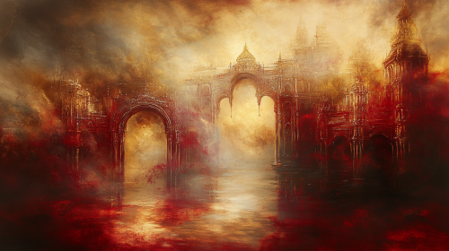 landscape paintings, in the style of dreamy, romanticized cityscapes, red and gold, orientalism, translucent water, majestic composition, liquid light emulsion, red --ar 16:9 --personalize icft26s --v 6.1