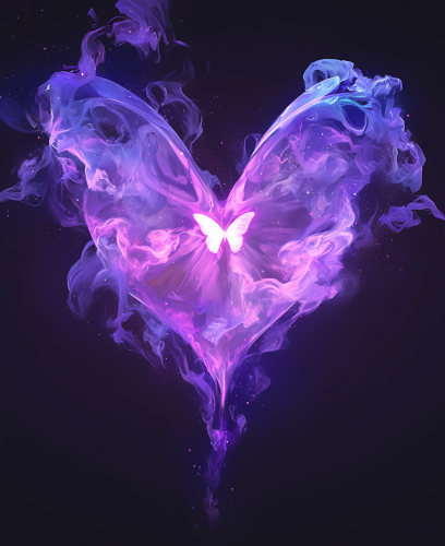 purple butterfly heart shape emoji beautiful 4k photorealistic surreal clouds ethereal majestic 8k panoramic, against a black background --niji 6 --ar 9:11