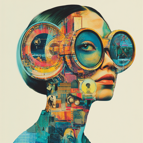 A photorealistic woman, mixed media collage, layered with surreal, pop-art style intricate and colorful patterns covering their face and clothing. The figure is wearing large, oversized glasses with one lens showing a detailed, close-up eye and the other featuring a graphic silhouette of a head with a target. The background within the head is filled with collage elements, futuristic patterns, and textures, incorporating geometric shapes, bright colors, and digital motifs. Additional circles surround the head, showing abstract images, symbols, and faces in retro-futuristic and cyberpunk-inspired style. The overall color palette is vibrant, with shades of teal, yellow, pink, and orange, giving the artwork a layered and complex look pop art surrealism --style raw --s 250