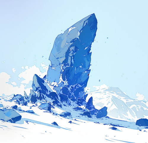A hand-drawn illustration of an isolated, light blue rock formation in the middle of snow-covered mountains. The background is a white sky with some clouds. In the style of digital art, with brush strokes and a color palette inspired by anime. It's a close-up shot, focusing on the sharp edges of the rocks. There are no text or other elements inside the illustration. --ar 125:122 --niji 6