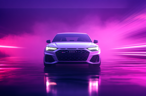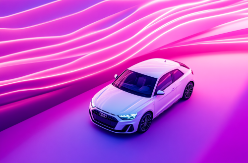 Real 2020 Audi A1, white body color with black details, parked in front of an abstract background with purple gradient colors, low saturation, featuring modern design elements and illuminated headlights. High angle, real car. The backdrop is a gradient from purple to pink. The overall composition captures motion blur and dynamic lighting, enhancing visual appeal. --ar 35:23