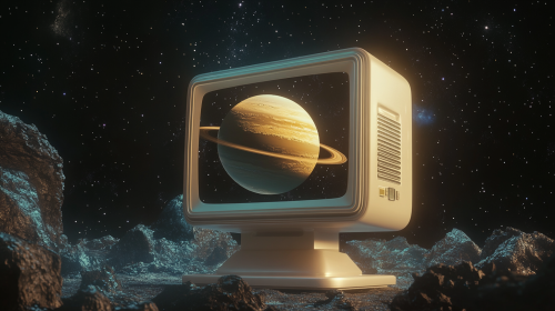 small 3d render of a crt macintosh monitor of old computer in center, little saturn figure in monitor, dreamy and cozy, calm, deep black space background, painted by rococo painting style --ar 16:9