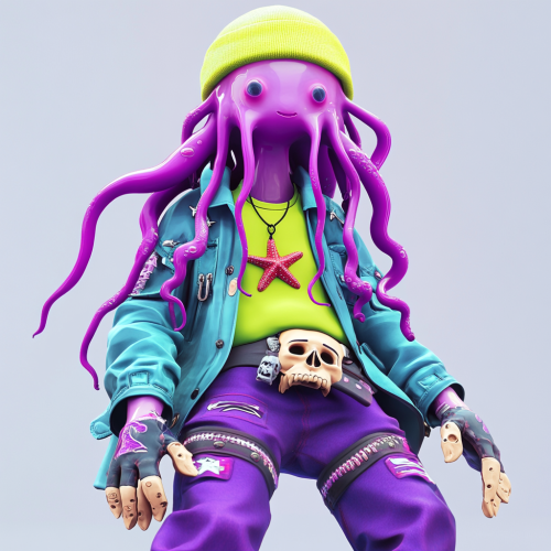 3D character design, jellyfish humanoid character, purple skin, tentacle-like appendages hanging from head instead of hair, wearing a beanie with a starfish decoration, neon green cropped shirt, blue jacket, purple pants, skull belt buckle, gloves, mischievous expression, youthful, punk rock aesthetic, highly detailed textures, realistic lighting, vibrant colors, high contrast, playful and rebellious look, relaxed seated pose