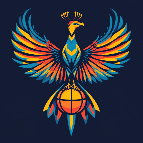 an basketball team logo.Reinvent the peacock with an eagle’s stance, wings spread wide, tail feathers fanned out like blades to imply strength and offense. The basketball is placed beneath the tail, symbolizing the foundation of the sport. Combines sharp lines with block colors, balancing a modern and powerful look.