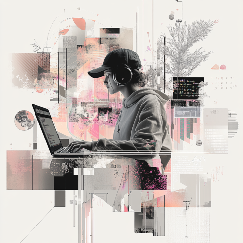 Generate a digital art for A digital art scene showing a professional in a modern classroom setting, engaging in skill development activities like coding on a laptop and attending a virtual workshop. The background is filled with abstract elements representing growth and learning. Use shades of light gray for the background. --ar 1:1